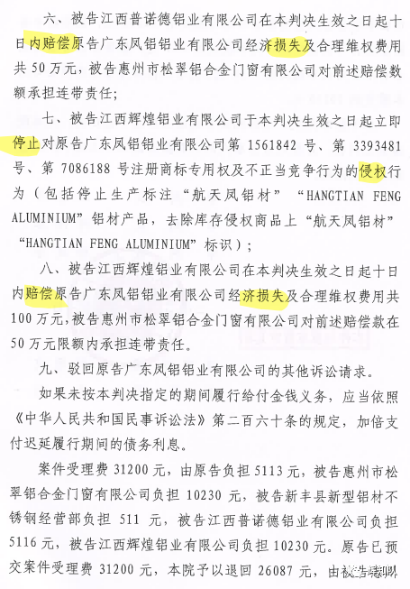 景德镇凤铝系列维权案:诉辉煌公司等四被告,法院判赔250余万